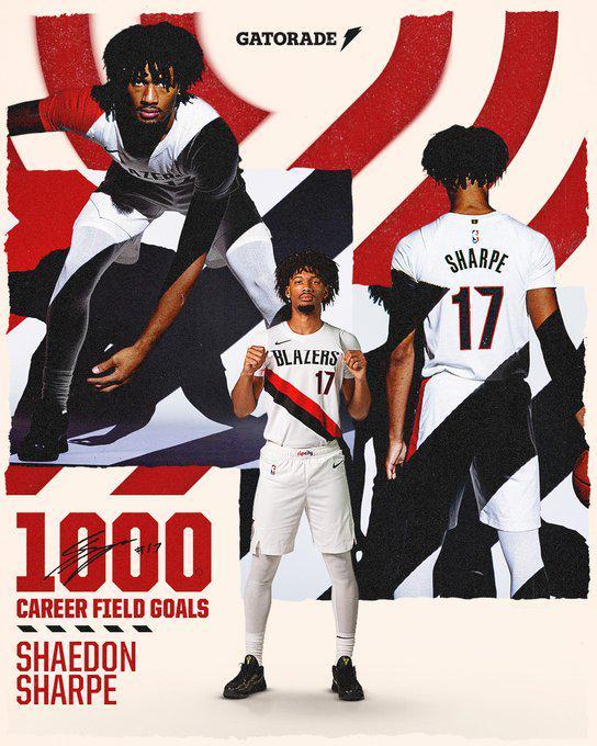 據開(kāi)拓者官方統計,夏普成為開(kāi)拓者隊史上達成1000個(gè)運動(dòng)戰進(jìn)球最年輕的球員。